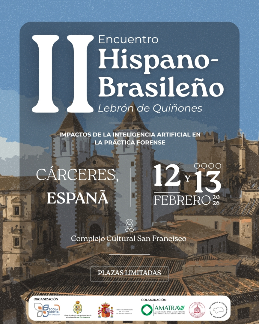 A Escola Judicial do Tribunal Regional do Trabalho da 7ª Região (EJUD7) convida servidores(as) interessados(as) a participar do II Encuentro Hispano-Brasileño de Escuelas de Jurisprudencia – Sobre Impactos de la Inteligencia Artificial en la Práctica Forense, que acontecerá nos dias 12 e 13 de fevereiro de 2026, na cidade de Cáceres, Espanha, no Complejo Cultural San Francisco.