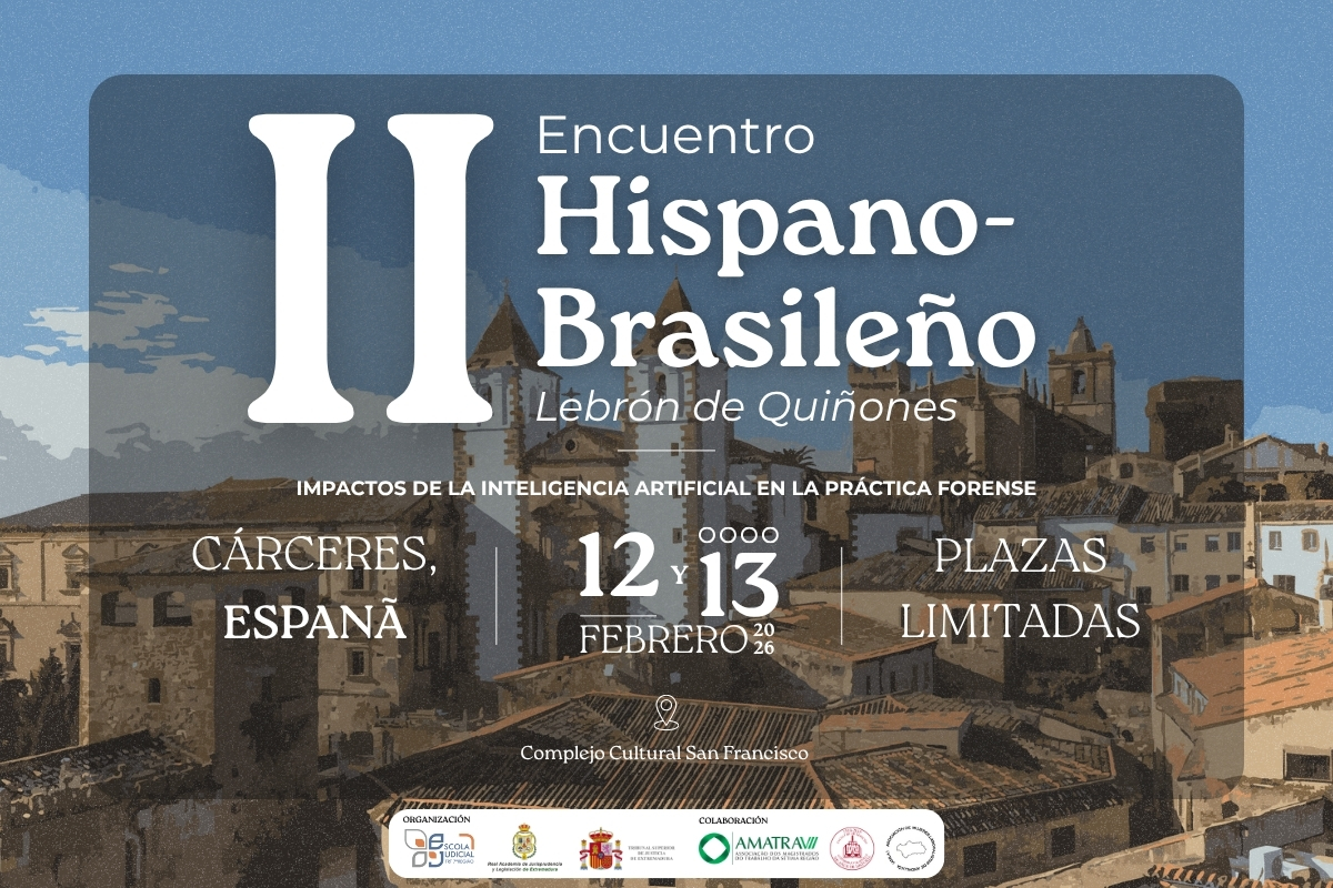 A Escola Judicial do TRT da 7ª Região (EJUD7) convida os(as) servidores(as) interessados(as) a participar do II Encuentro Hispano-Brasileño Lebron de Quiñones – Impactos de la Inteligencia Artificial en la Práctica Forense, que será realizado nos dias 12 e 13 de fevereiro de 2026, em Cáceres, Espanha, no Complejo Cultural San Francisco.