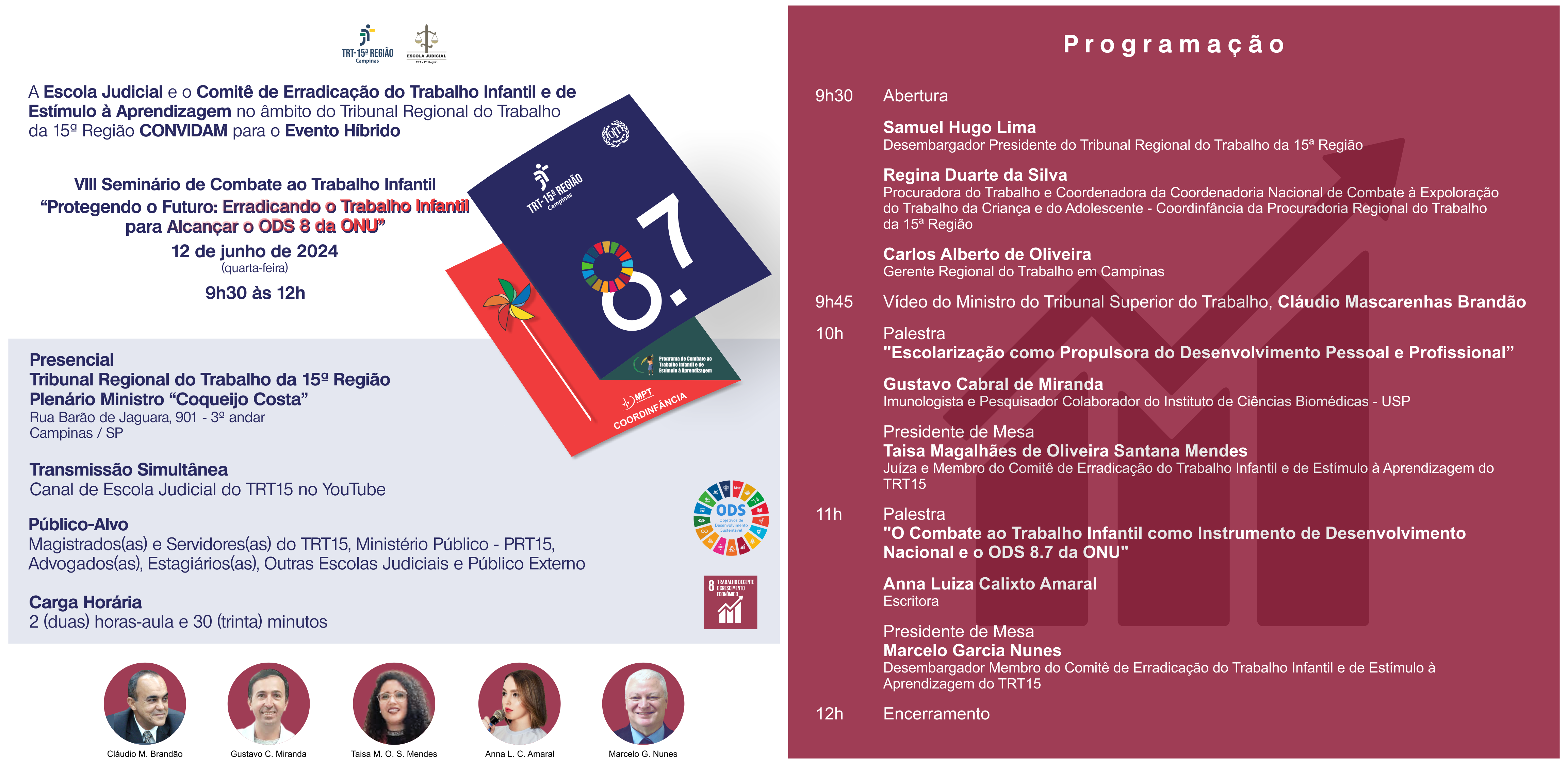 A Escola Judicial do Tribunal Regional do Trabalho da 15ª Região, considerando as diretrizes traçadas pela ENAMAT de prática de compartilhamento de ações formativas, convida as demais Regionais para participarem do VIII Seminário de Combate ao Trabalho Infantil - "Protegendo o Futuro: Erradicando o Trabalho Infantil para Alcançar a ODS 8 da ONU", que será realizado nos dias 12 de junho de 2024.