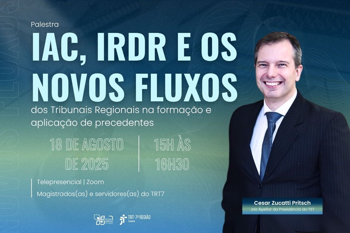 A Escola Judicial do TRT da 7ª Região tem a honra de convidar magistrados(as) e servidores(as) para a palestra "IAC, IRDR e os novos fluxos dos Tribunais Regionais na formação e aplicação de precedentes", que ocorrerá no dia 18 de agosto de 2025, a qual marcará a abertura da Semana Nacional de Precedentes da Justiça do Trabalho, conforme o Ofício Circular Conjunto TST.CSJT.GP nº 372/2025.