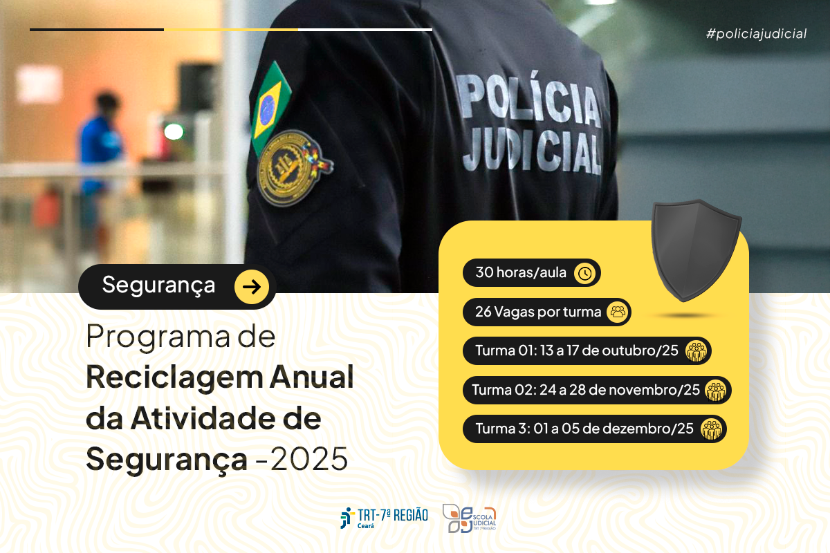 Inscrições abertas para as turmas do Programa de Reciclagem Anual da Atividade de Segurança – 2025, voltado à capacitação dos Agentes de Polícia Judicial do TRT da 07ª Região, que serão realizadas nos meses de outubro (turma 01), novembro (turma 02) e dezembro (turma 03) de 2025.