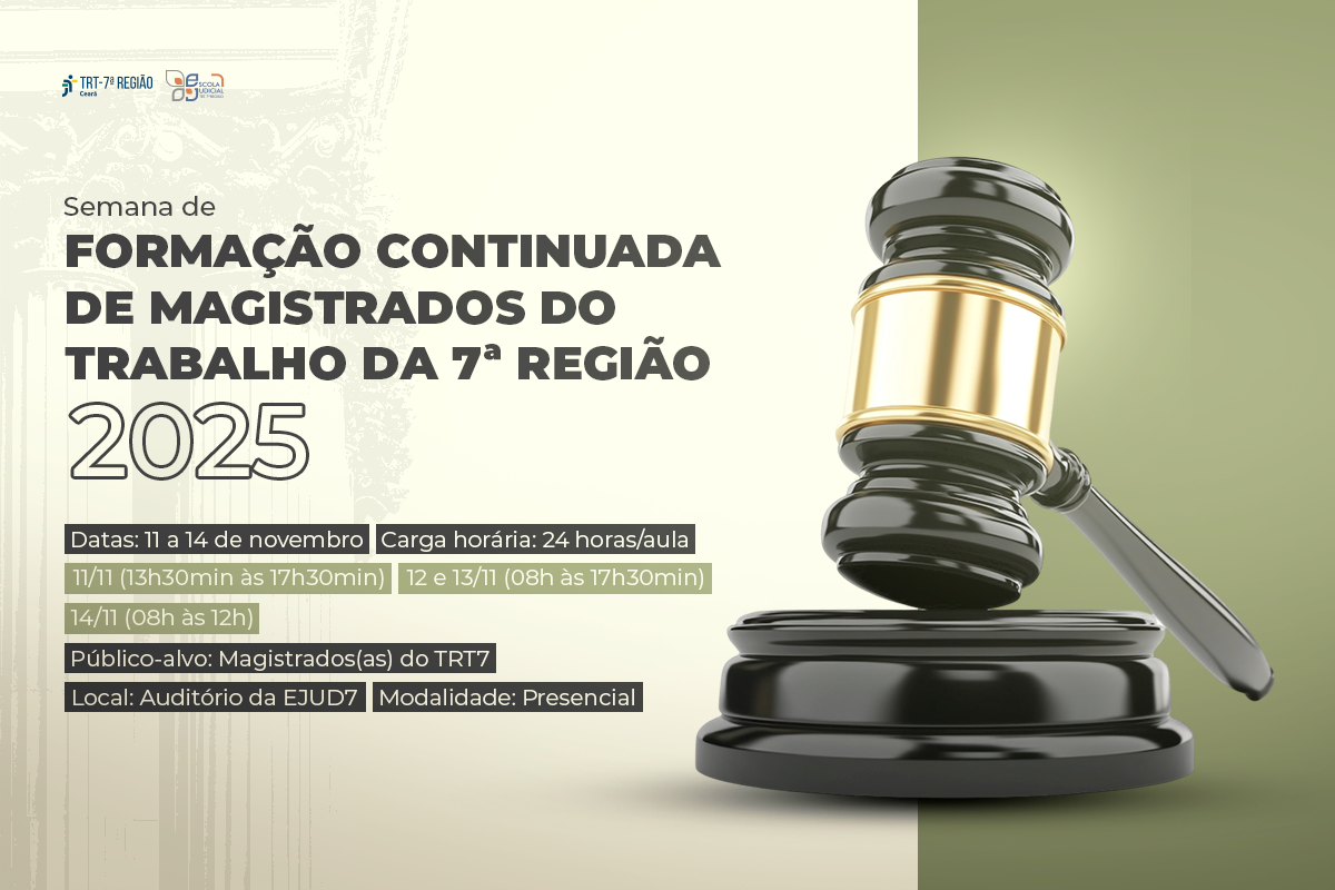 O Tribunal Regional do Trabalho da 7ª Região, por meio de sua Escola Judicial, realizará a Semana de Formação Continuada de Magistrados do Trabalho da 7ª Região - 2025, no período de 11 a 14 de novembro de 2025, na modalidade presencial, no auditório da Escola Judicial.