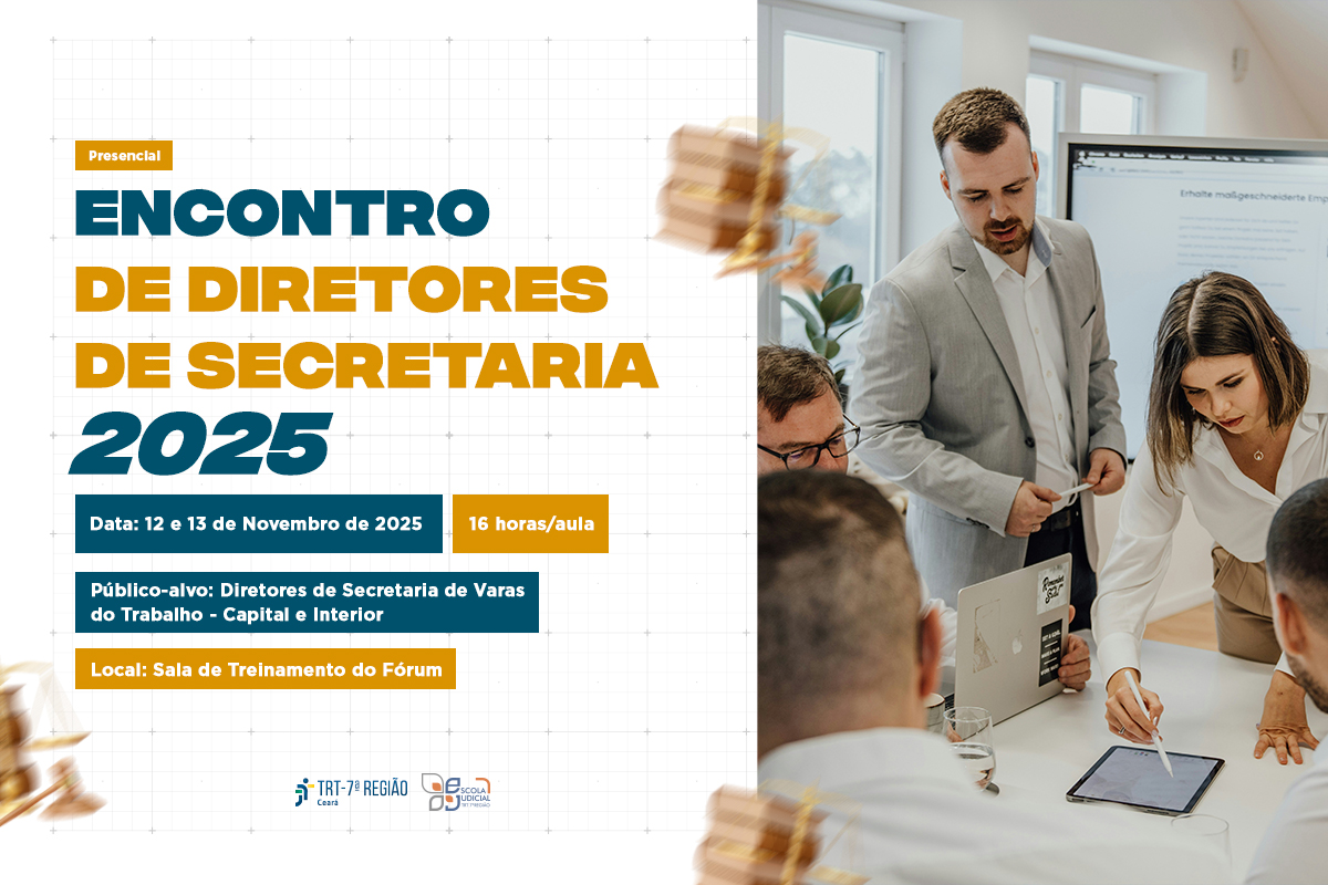 A Escola Judicial do TRT da 7ª Região realizará, nos dias 12 e 13 de novembro de 2025, o Encontro de Diretores de Secretaria - 2025, evento anual que promove o diálogo, a troca de experiências e o fortalecimento das práticas de gestão nas Varas do Trabalho.
