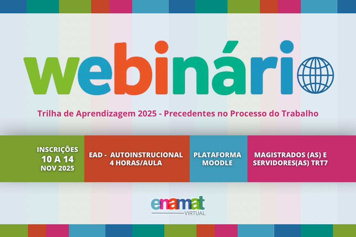 A Escola Judicial do Tribunal Regional do Trabalho da 7ª Região (EJUD7), em parceria com a Escola Nacional de Formação e Aperfeiçoamento de Magistrados do Trabalho (ENAMAT), promoverá, entre os dias 10 e 27 de novembro de 2025, o curso “Webinário sobre Precedentes no Processo do Trabalho”.