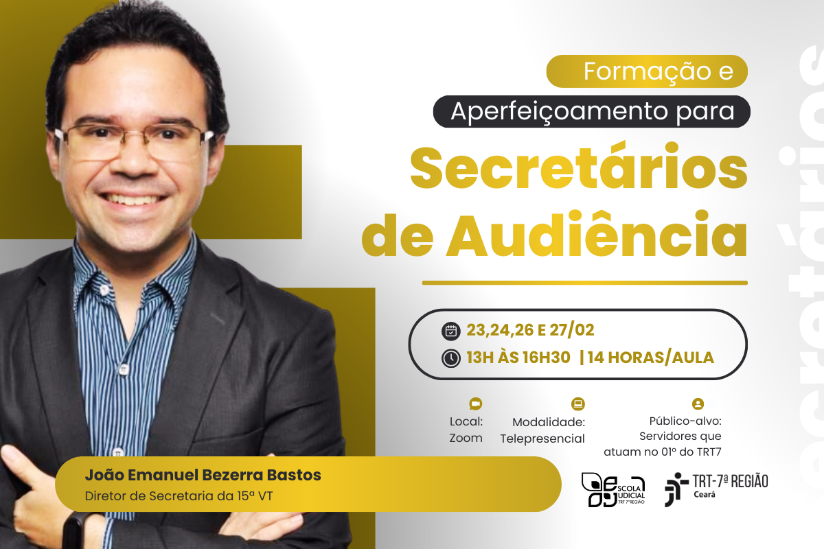 A Escola Judicial do Tribunal Regional do Trabalho da 7ª Região (EJUD7) promoverá, no período de 23, 24, 26 e 27 de fevereiro de 2026, o Curso de Formação e Aperfeiçoamento para Secretários de Audiência, que será ministrado por João Emanuel Bezerra Bastos, Diretor de Secretaria da 15ª Vara do Trabalho, na modalidade telepresencial, pelo Zoom, das 13h às 16h30.