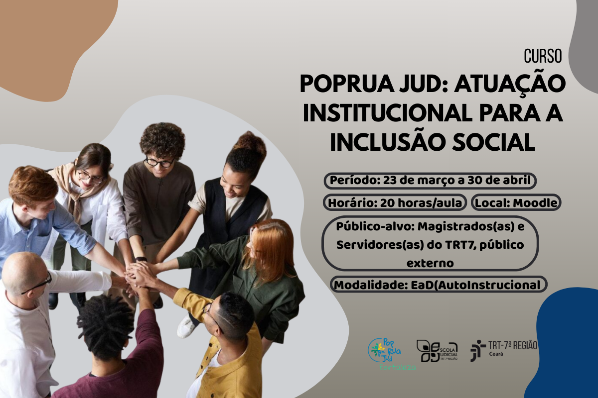 A Escola Judicial do TRT da 7ª Região (EJUD7), em parceria com o Comitê Local do PopRuaJud, promoverá o Curso: PopRua Jud - atuação institucional para a inclusão social, no período de 23 de março a 30 de abril de 2026, na modalidade EAD - Autoinstrucional, por meio da plataforma Moodle.