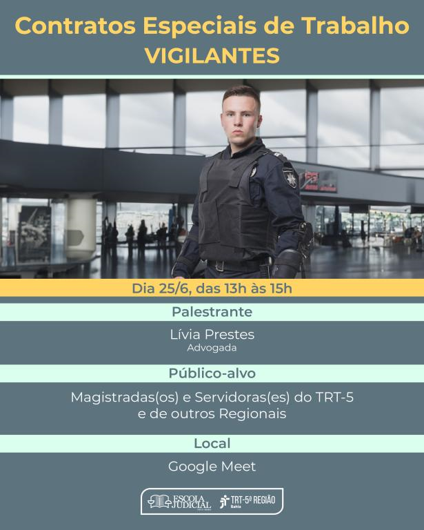 O Tribunal Regional do Trabalho da 5ª Região, considerando suas diretrizes de prática de compartilhamento de ações formativas, convida a todas as Regionais para participarem do curso "Contratos Especiais de Trabalho - Vigilantes", que será realizado no dia 25 de junho de 2024.