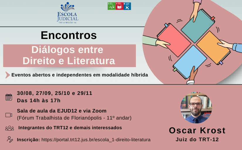 A Escola Judicial do Tribunal Regional do Trabalho da 12ª Região, considerando as diretrizes traçadas pela ENAMAT de prática de compartilhamento de ações formativas, convida as demais Regionais para participarem dos Encontros "Diálogos entre Direito e Literatura" na sua 2ª edição'', que será realizado no período de 27 de setembro, 25 de outubro e 29 de novembro de 2024.