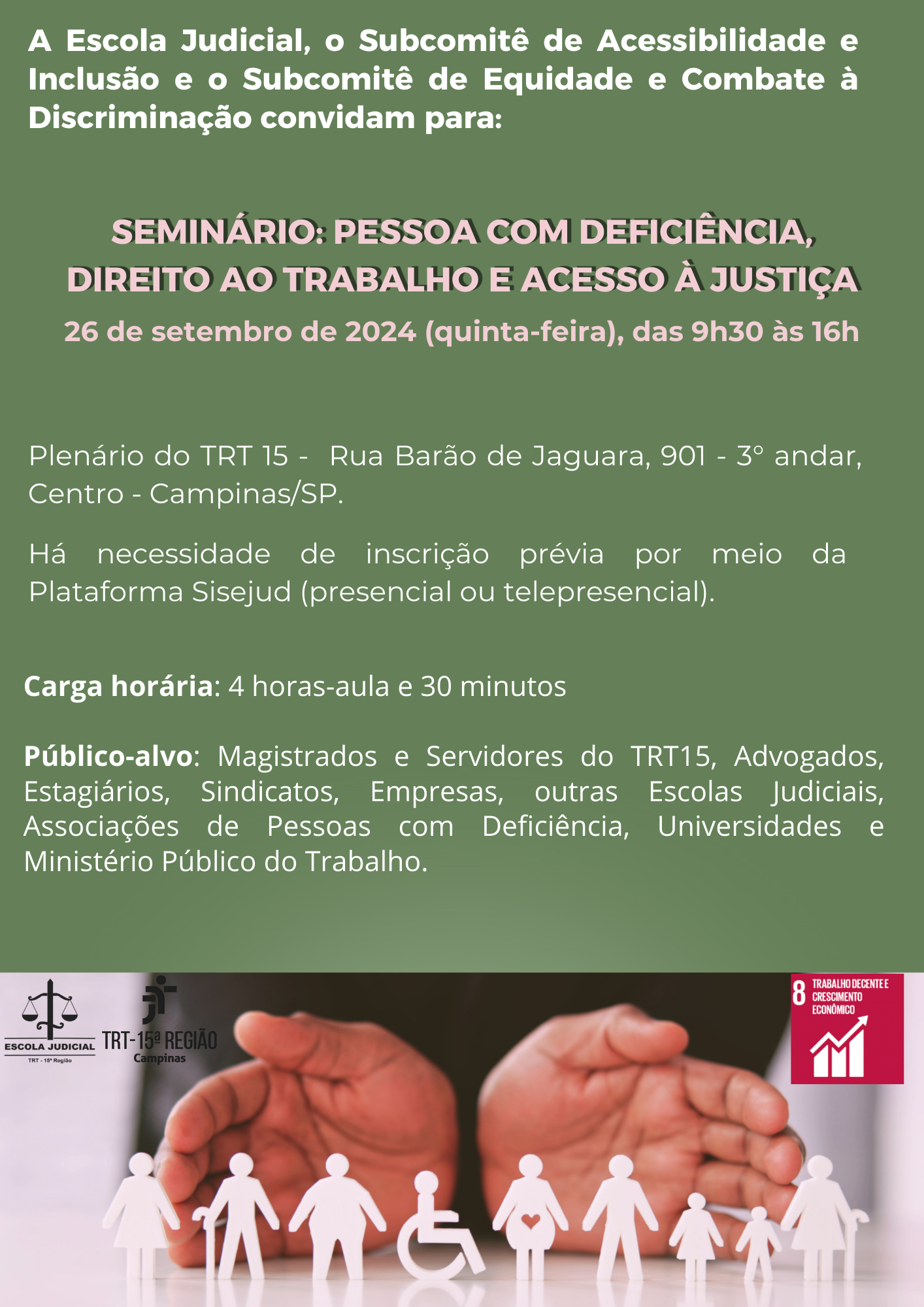 A Escola Judicial do Tribunal Regional do Trabalho da 15ª Região, considerando as diretrizes traçadas pela ENAMAT de prática de compartilhamento de ações formativas, convida as demais Regionais para participarem do Seminário "Pessoa com Deficiência, Direito ao Trabalho e Acesso á Justiça", que será realizado no dia 26 de setembro de 2024.