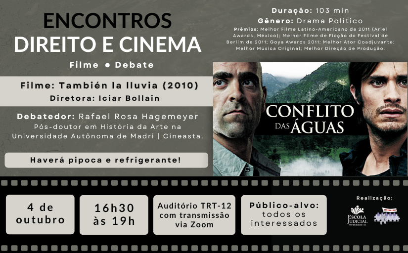 A Escola Judicial do Tribunal Regional do Trabalho da 12ª Região, considerando as diretrizes traçadas pela ENAMAT de prática de compartilhamento de ações formativas, convida as demais Regionais para participarem do Curso "3º Encontro de Direito e Cinema", na modalidade Telepresencial, com Rafael Rosa Hagemeyer e Adailton Pires Costa, que será realizado na data de 4 de outubro de 2024.