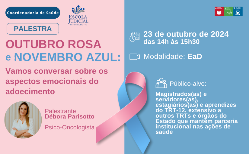 A Escola Judicial do Tribunal Regional do Trabalho da 12ª Região, considerando as diretrizes traçadas pela ENAMAT de prática de compartilhamento de ações formativas, convida as demais Regionais para participarem da Palestra "Outubro Rosa e Novembro Azul - Vamos conversar sobre os aspectos emocionais do adoecimento", na modalidade Telepresencial, que será realizado na data de 23 de outubro de 2024.