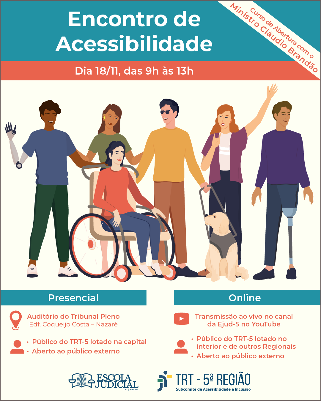 A Escola Judicial do Tribunal Regional do Trabalho da 5ª Região, considerando as diretrizes traçadas pela ENAMAT de prática de compartilhamento de ações formativas, convida as demais Regionais para participarem do evento ''Encontro de Acessibilidade'', na modalidade Presencial, que será realizado na data de 18 de novembro de 2024.
