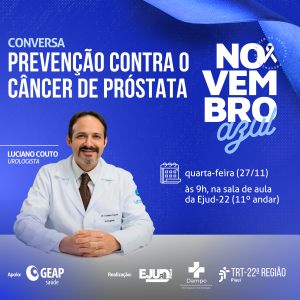 A Escola Judicial do Tribunal Regional do Trabalho da 22ª Região, considerando as diretrizes traçadas pela ENAMAT de prática de compartilhamento de ações formativas, convida as demais Regionais para participarem do Evento em Alusão ao Novembro Azul - Conversa sobre Prevenção contra o Câncer de Próstata, na modalidade semipresencial, que será realizado dia 27 de novembro de 2024, das 09h às 11h.