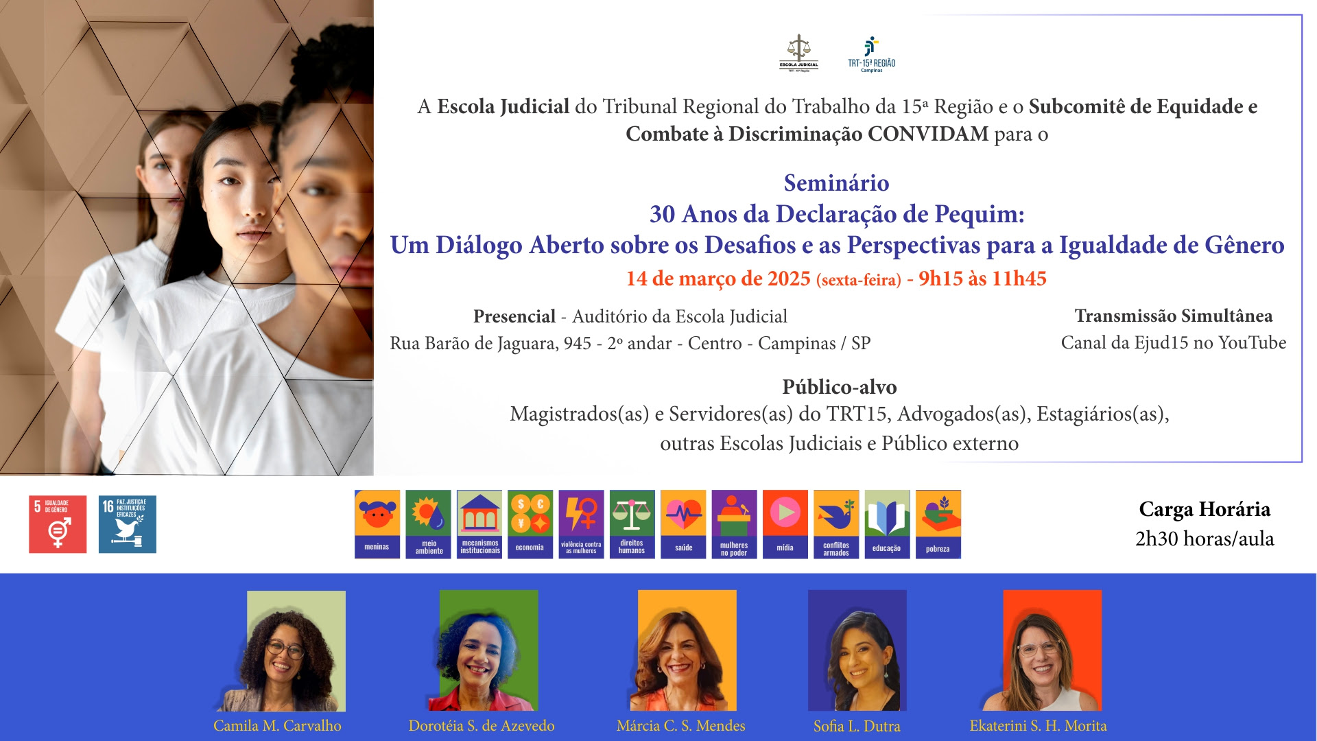 A Escola Judicial do Tribunal Regional do Trabalho da 15ª Região realizará o Seminário "30 Anos da Declaração de Pequim: um diálogo aberto sobre os desafios e as perspectivas para a Igualdade de Gênero", dia 14 de março de 2025 (sexta-feita), das 09h15 às 11h45, na modalidade presencial com transmissão simultânea no canal da Ejud 15 no Youtube.