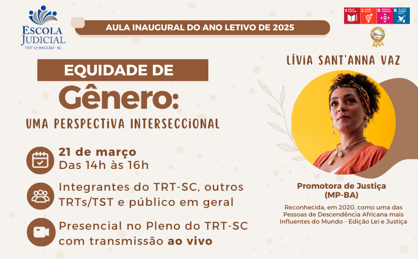 A Escola Judicial do Tribunal Regional do Trabalho da 12ª Região convida para a Aula Inaugural do Ano Letivo de 2025 "Equidade de gênero: uma perspectiva interseccional", dia 21 de março de 2025 (sexta-feita), das 14h às 16h, na Modalidade Presencial no Pleno do TRT-SC com transmissão ao vivo.