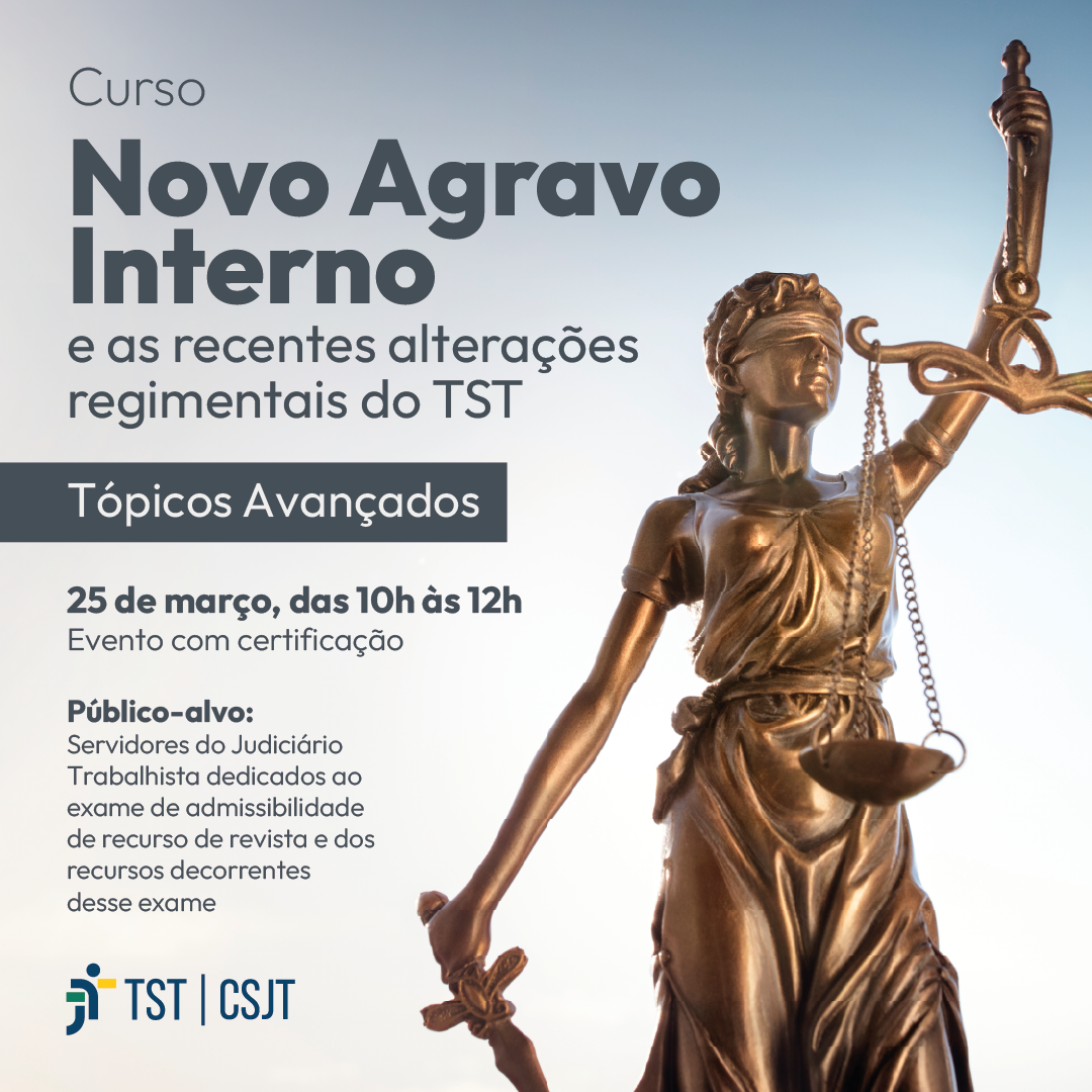 O Conselho Superior da Justiça do Trabalho (CSJT) promoverá o Webinário “Novo” Agravo Interno e as Recentes Alterações Regimentais do TST - Tópicos Avançados.