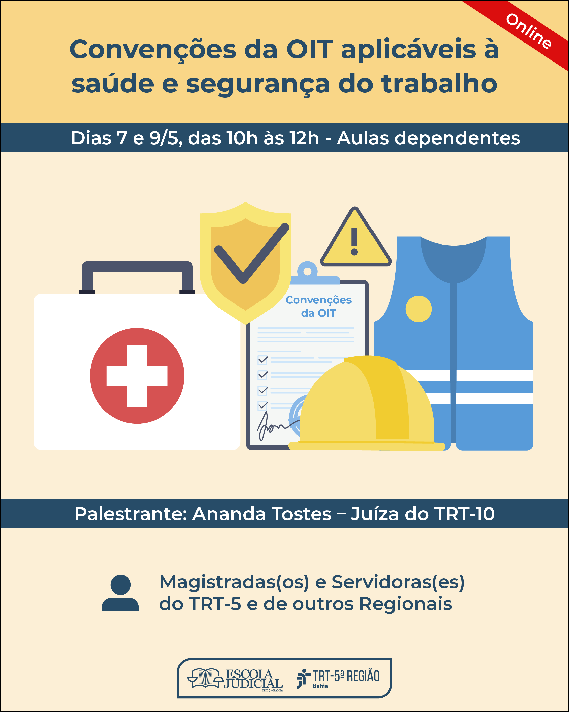 A Escola Judicial do Tribunal Regional do Trabalho da 5ª Região (Ejud-5) convida para o curso "Convenções da OIT aplicáveis à saúde e segurança do trabalho", que será ministrado telepresencialmente por meio da plataforma Google Meet, nos dias 7 e 9 de maio de 2025, das 10h às 12h, compreendendo uma carga horária total de 4 horas.
