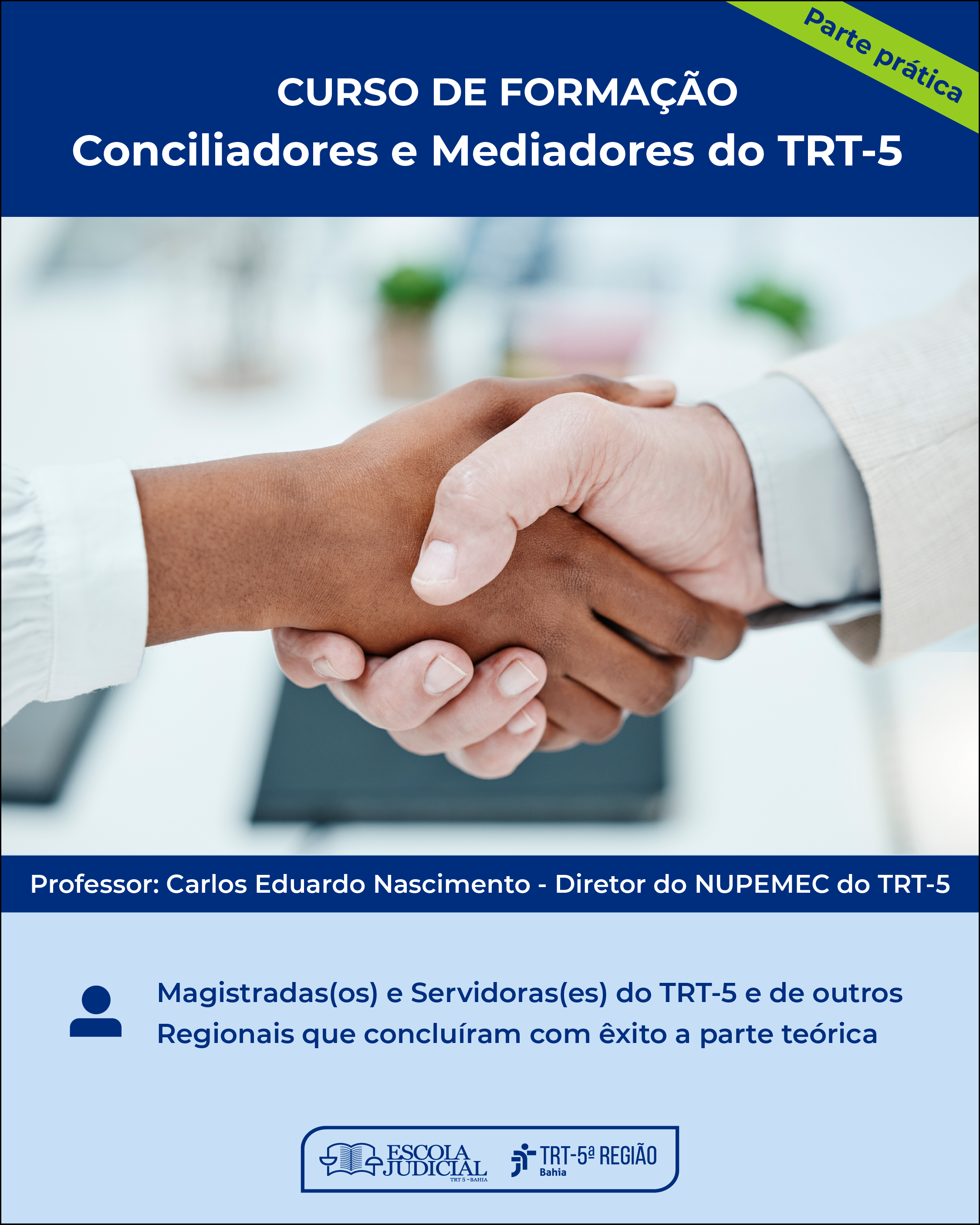 A Escola Judicial do Tribunal Regional do Trabalho da 5ª Região (Ejud-5) convida para o "Curso de Formação de Conciliadores e Mediadores - Parte Prática", que será ministrado telepresencialmente por meio da plataforma Google Meet, do dia 8 de maio até 21 de outubro de 2025, compreendendo uma carga horária total de 77 horas. A capacitação é voltada para magistrados(as) e servidores(as) do TRT-5 e de outros regionais que concluíram a parte teórica do curso, com 26 vagas oferecidas.