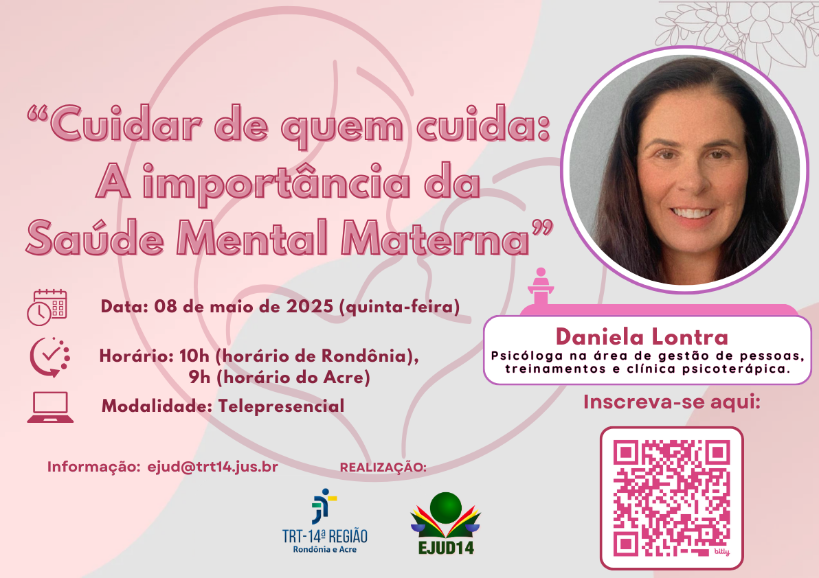 A Escola Judicial da 14ª Região convida magistrados(as), servidores(as), terceirizados(as) e a sociedade em geral para a palestra “Cuidar de quem cuida: A importância da Saúde Mental Materna”, que será ministrada pela psicóloga Daniela Lontra, profissional com mais de 25 anos de experiência nas áreas de gestão de pessoas, treinamentos e clínica psicoterápica.