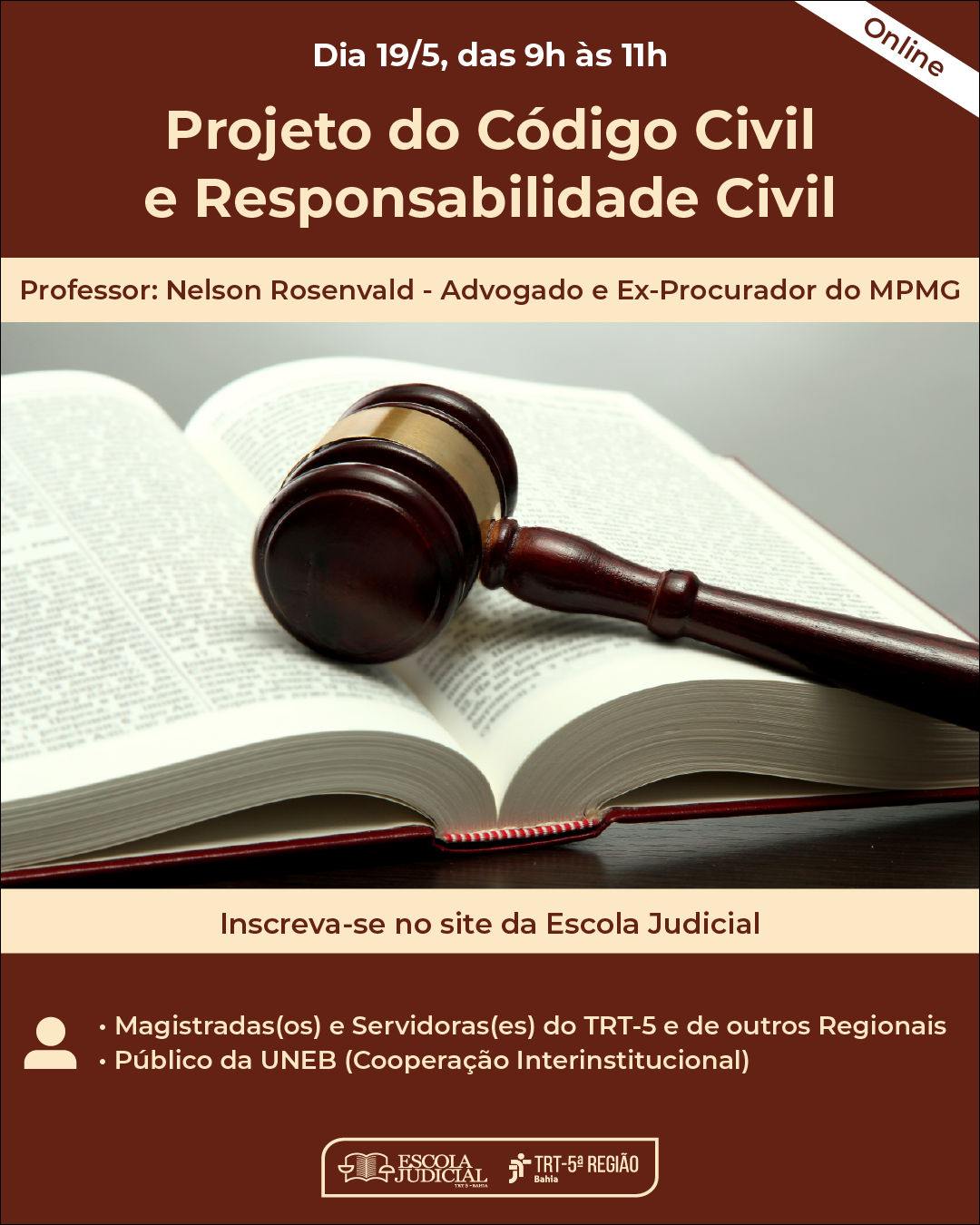 A Escola Judicial do Tribunal Regional do Trabalho da 5ª Região (Ejud-5) convida para o curso "Projeto do Código Civil e Responsabilidade Civil", que será ministrado por Nelson Rosenvald, na modalidade telepresencial, no dia 19 de maio de 2025, das 9h às 11h.