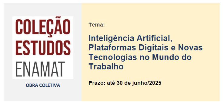 A Escola Nacional de Formação e Aperfeiçoamento de Magistrados do Trabalho (Enamat), dando continuidade às publicações da coletânea “Coleção Estudos Enamat”, lança nova chamada de artigos para a obra coletiva: