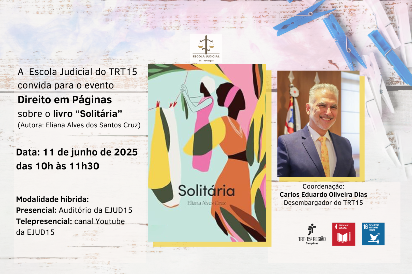 A Escola Judicial do Tribunal Regional do Trabalho da 15ª Região (Ejud-15) convida para o evento "Direito em Páginas" sobre o livro "Solitária", que será transmitido ao vivo no dia 11 de junho de 2025, das 10h às 11h30, sob coordenação do desembargador do TRT-15 Carlos Eduardo Oliveira Dias.