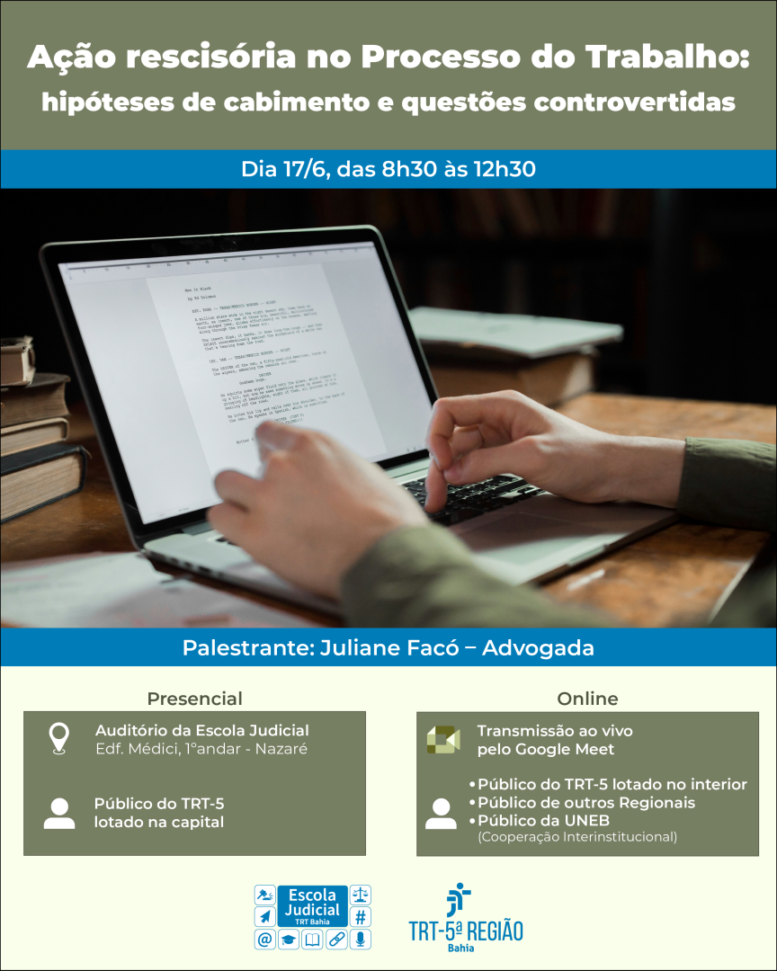 A Escola Judicial do Tribunal Regional do Trabalho da 5ª Região (Ejud-5) convida para a aula "Ação rescisória no Processo do Trabalho: hipóteses de cabimento e questões controvertidas", que será ministrada por Juliane Facó, na modalidade telepresencial, no dia 17 de junho de 2025, das 8h30 às 12h30.