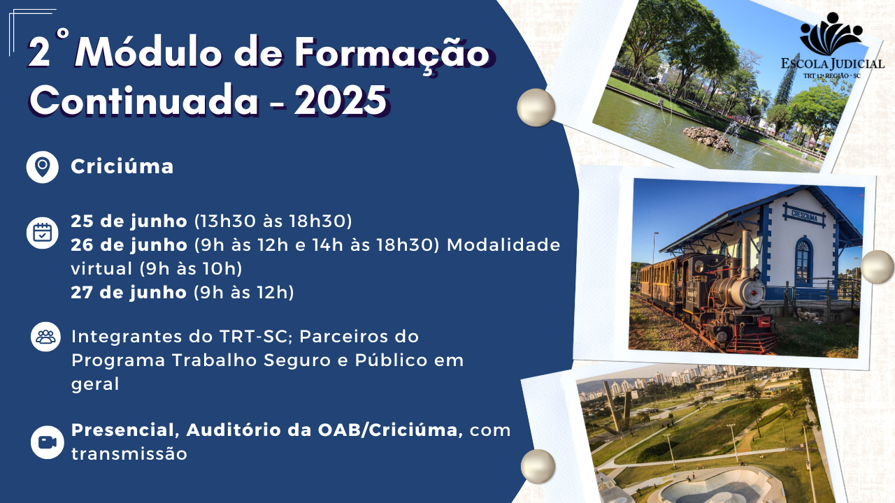 A Escola Judicial do Tribunal Regional do Trabalho da 12ª Região (Ejud-12) promoverá, no período de 25 a 27 de junho de 2025, o "2º Módulo de Formação Continuada 2025 - 20 anos de Ejud-12: fortalecendo laços, revisitando temas e debatendo inquietações contemporâneas".