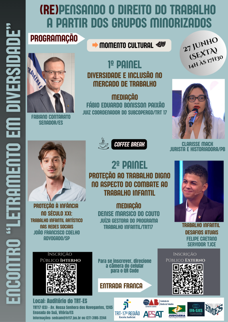 A Escola Judicial do Tribunal Regional do Trabalho da 17ª Região (Ejud-17) convida para o Encontro "Letramento em Diversidade", que será realizado na modalidade ensino presencial, no dia 27 de junho de 2025, das 14h às 17h30, no auditório do TRT-17, em Vitória-ES.