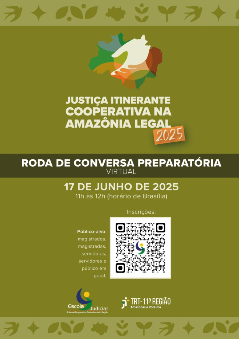 A Desembargadora Ruth Barbosa Sampaio, diretora da Escola Judicial do TRT da 11ª Região (Ejud-11) convida todas e todos para participarem da Roda de Conversa Virtual que integra a etapa preparatória da Justiça Itinerante Cooperativa na Amazônia Legal (JICAL), promovida pelo Conselho Nacional de Justiça (CNJ).