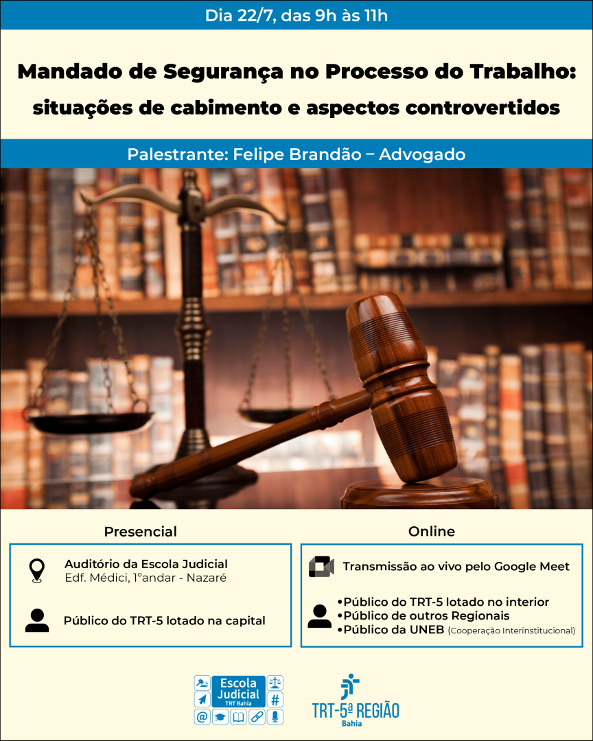 A Escola Judicial do Tribunal Regional do Trabalho da 5ª Região (Ejud-5) convida para a aula "Mandado de Segurança no Processo do Trabalho: situações de cabimento e aspectos controvertidos", que será transmitida ao vivo no dia 22 de julho de 2025, das 9h às 11h.