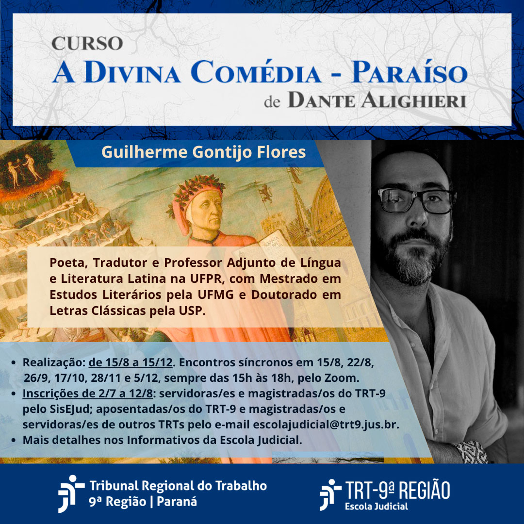 O curso “A Divina Comédia, de Dante Alighieri”, promovido pela Presidência do Tribunal Regional do Trabalho da 9ª Região em parceria com a Escola Judicial, terá continuidade no 2º semestre de 2025 com a terceira e última parte da obra denominada “Paraíso”.