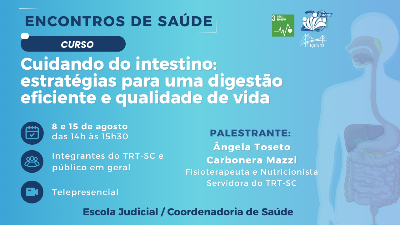 A Escola Judicial do Tribunal Regional do Trabalho da 12ª Região (Ejud-12) convida para o curso "Cuidando do intestino: estratégias para uma digestão eficiente e qualidade de vida", que será ministrado na modalidade telepresencial, nos dias 8 e 15 de agosto de 2025, das 14h às 15h30.