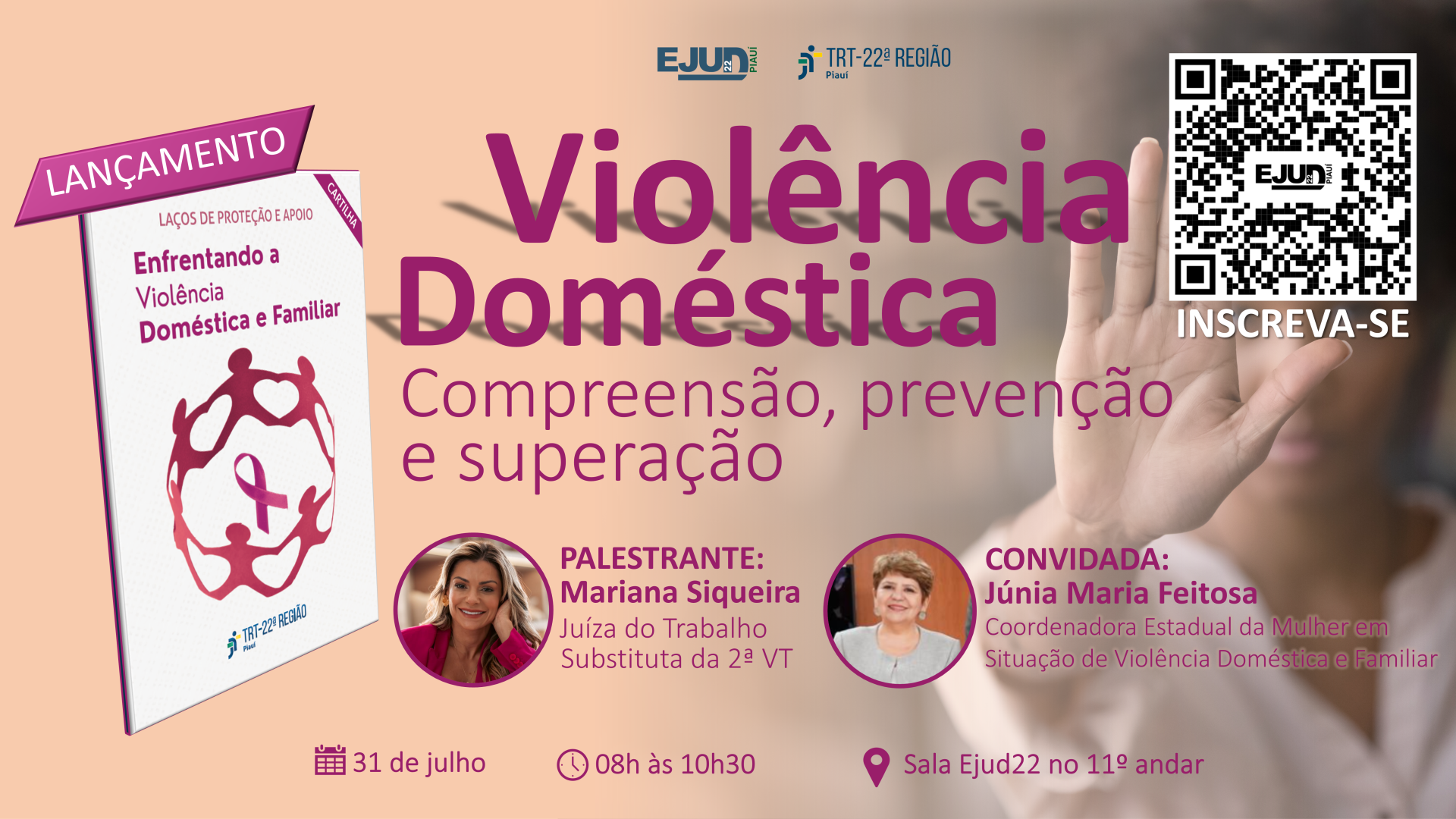 O evento é aberto a todos. A programação começa às 8h30, na sala de aula da Ejud-22 do 11º andar do edifício-sede, com a apresentação da juíza do trabalho Mariana Siqueira e participação da juíza criminal do Tribunal de Justiça do Piauí (TJ/PI). Na ocasião, será lançada a cartilha "Enfrentando a Violência Doméstica e Familiar", produzida pelo TRT Piauí, com informações essenciais sobre os tipos de violência e orientações sobre como buscar ajuda.
