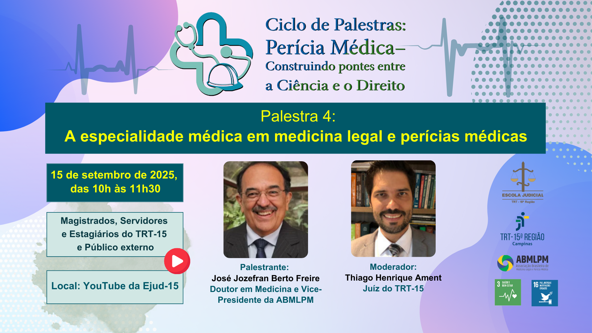 A Escola Judicial do Tribunal Regional do Trabalho da 15ª Região (Ejud-15) convida para a Palestra 4 do "Ciclo de Palestras: Perícia Médica", intitulada "A especialidade médica em medicina legal e perícias médicas", que será transmitida ao vivo pelo canal da Ejud-15 no YouTube, a partir das 10h.