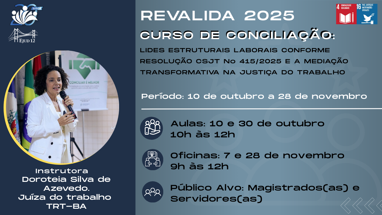 Ejud-12 - Curso - REVALIDA 2025 - Curso de Conciliação: Lides estruturais laborais conforme Resolução CSJT nº 415/2025 e a mediação transformativa na Justiça do Trabalho