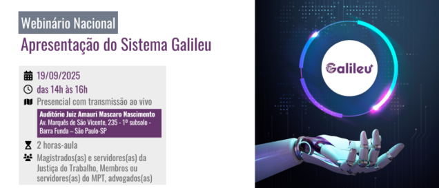 O Tribunal Regional do Trabalho da 2ª Região promoverá o "Webinário Nacional de Apresentação do Sistema Galileu", que ocorrerá no dia 19 de setembro de 2025, das 14h às 16h (horário de Brasília).