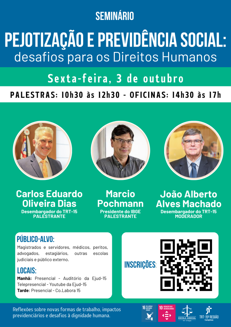 O Tribunal Regional do Trabalho da 15ª Região promoverá o Seminário: “Pejotização e previdência social: desafios para os Direitos Humanos", que ocorrerá no dia 03 de outubro de 2025, das 10h30 às 12h30 e das 14h30 às 17h00.