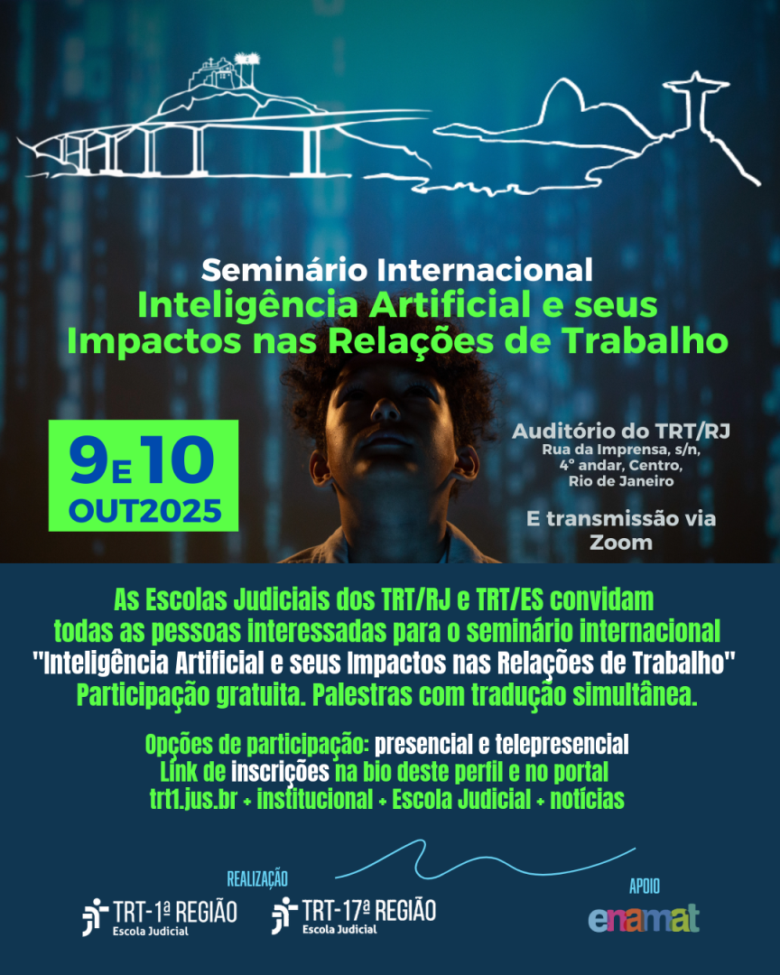 As Escolas Judiciais dos TRTs do Rio de Janeiro e do Espírito Santo (Ejud-1 e Ejud-17) convidam todas as pessoas interessadas para o Seminário Internacional - Inteligência Artificial e seus Impactos nas Relações de Trabalho, que se realizará nos dias 9 e 10 de outubro de 2025, na modalidade presencial - no Rio de Janeiro, com transmissão ao vivo pela plataforma Zoom.
