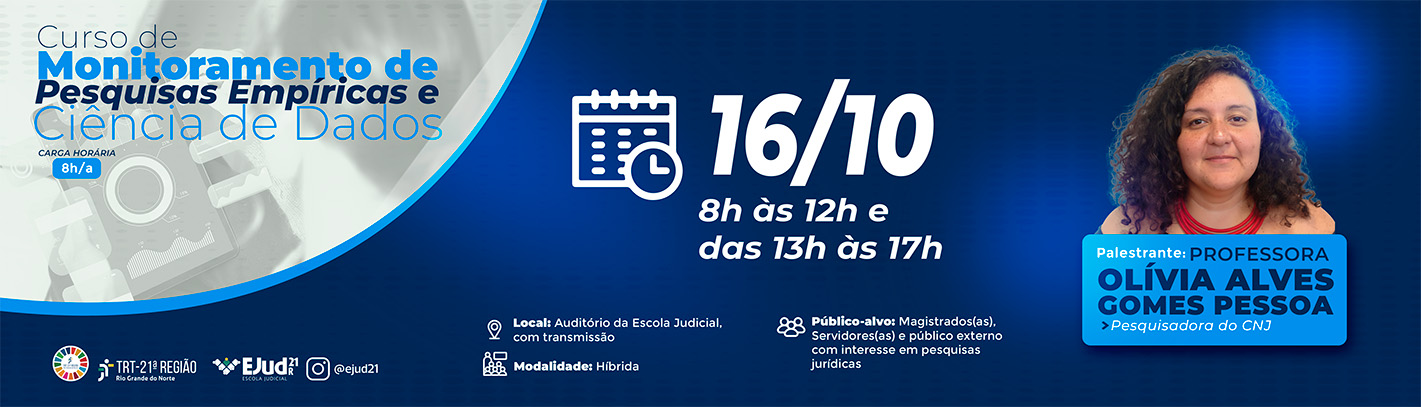 A Escola Judicial do TRT-21 convida magistrados(as), servidores(as) e demais interessados(as) a participarem do Curso “Monitoramento de Pesquisas Empíricas e Ciência de Dados”, no dia 16/10/2025, das 8h às 12h e 13h às 17h, no auditório da Ejud21, com transmissão on-line. A capacitação tem como objetivo oferecer ferramentas e conhecimentos fundamentais para o acompanhamento e a avaliação das pesquisas atualmente em andamento, resultado da parceria firmada entre o TRT da 21ª Região e a Universidade Federal do Rio Grande do Norte (UFRN).