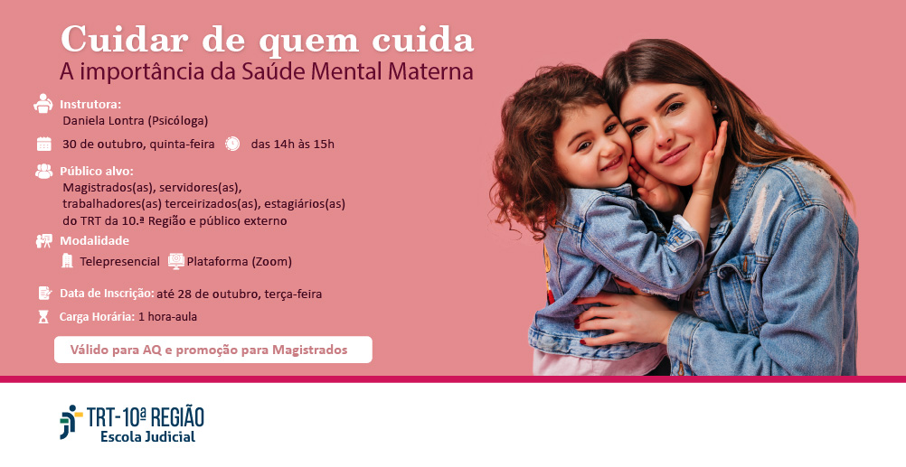 A ação "Cuidar de quem cuida: A importância da Saúde Mental Materna" ocorre em 30 de outubro, quinta-feira, das 14h às 15h, na modalidade telepresencial (plataforma Zoom). O objetivo é refletir sobre os impactos da maternidade na saúde mental, visando o bem-estar emocional das trabalhadoras e trabalhadores e todos os envolvidos. As inscrições estão abertas no SISEJUD. A palestrante será a psicóloga Daniela Lontra, profissional com mais de 25 anos de experiência nas áreas de gestão de pessoas, treinamentos e clínica psicoterápica. Entre os temas abordados, temos: