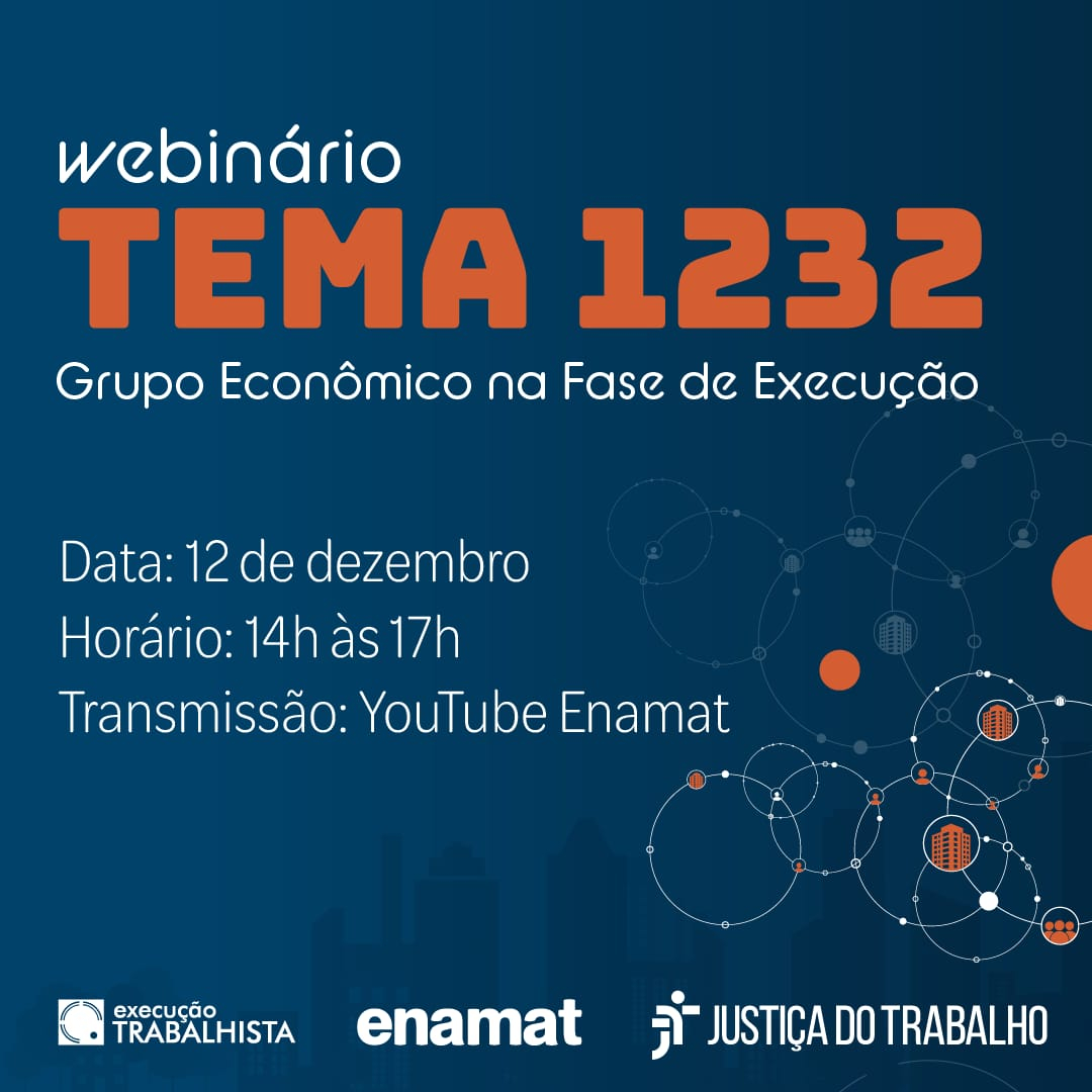 A Escola Nacional de Formação e Aperfeiçoamento de Magistrados do Trabalho (ENAMAT) correalizará, juntamente com o Centro de Formação e Aperfeiçoamento de Assessores e Servidores do Tribunal Superior do Trabalho (CEFAST TST) e o Conselho Superior Justiça do Trabalho (CSJT) o webinário Tema 1232 – Grupo Econômico na Fase de Execução.