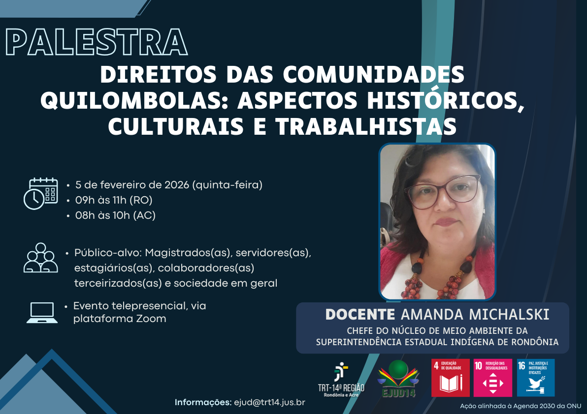 A Escola Judicial do Tribunal Regional do Trabalho da 14ª Região (TRT14) realiza a Palestra “Direitos das Comunidades Quilombolas: Aspectos Históricos, Culturais e Trabalhistas”, a ser ministrada pela Professora Amanda Michalski, conforme informações a seguir: