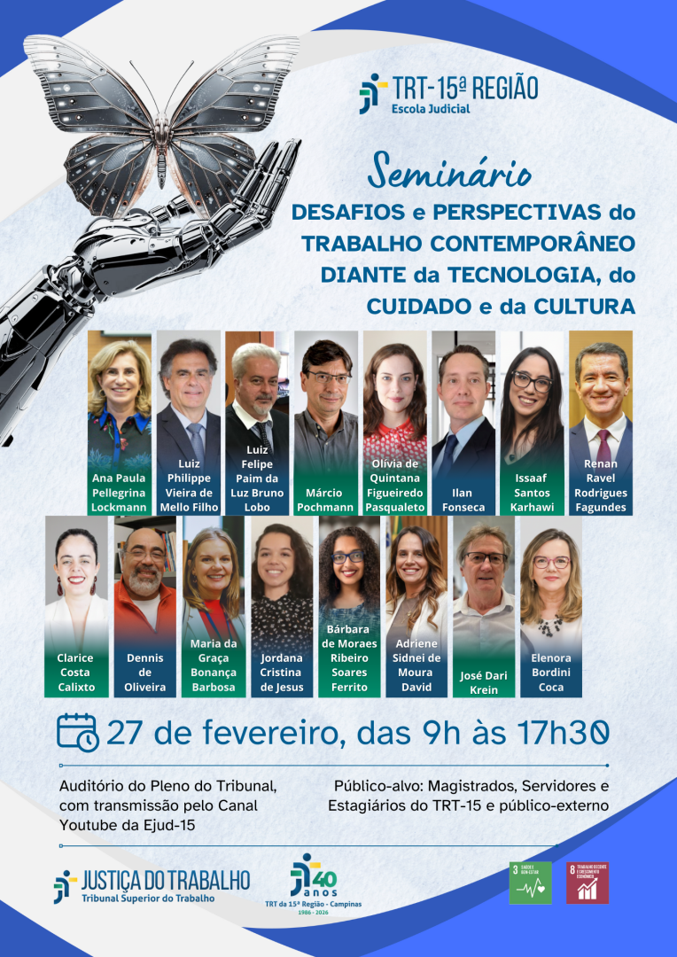 A Escola Judicial do Tribunal Regional do Trabalho da 15ª Região (EJUD15) convida magistrados(as), servidores(as), estagiários(as) e público externo a participarem do Seminário" Desafios e Perspectivas do Trabalho Contemporâneo diante da Tecnologia, do Cuidado e da Cultura" no Auditório do Pleno do TRT15 com transmissão pelo Canal Youtube da Ejud-15.