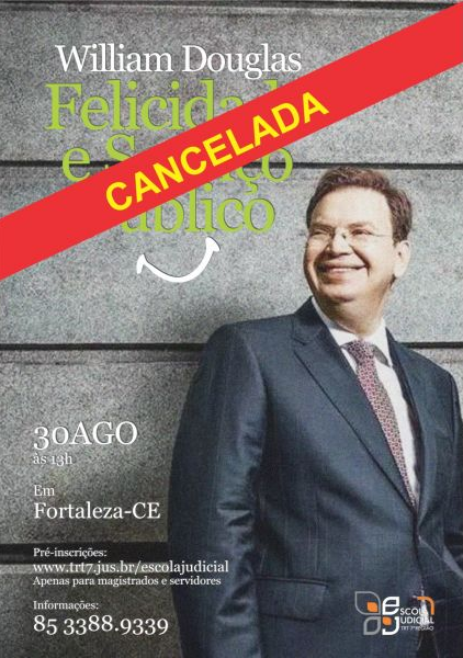 A Escola Judicial do TRT/CE informa que a palestra "Felicidade e Serviço Público", que aconteceria nesta quarta-feira (30), às 13h, pelo Dr. William Douglas, Juiz Federal do TRF da 02ª Região, foi cancelada por razões pessoais do mesmo.