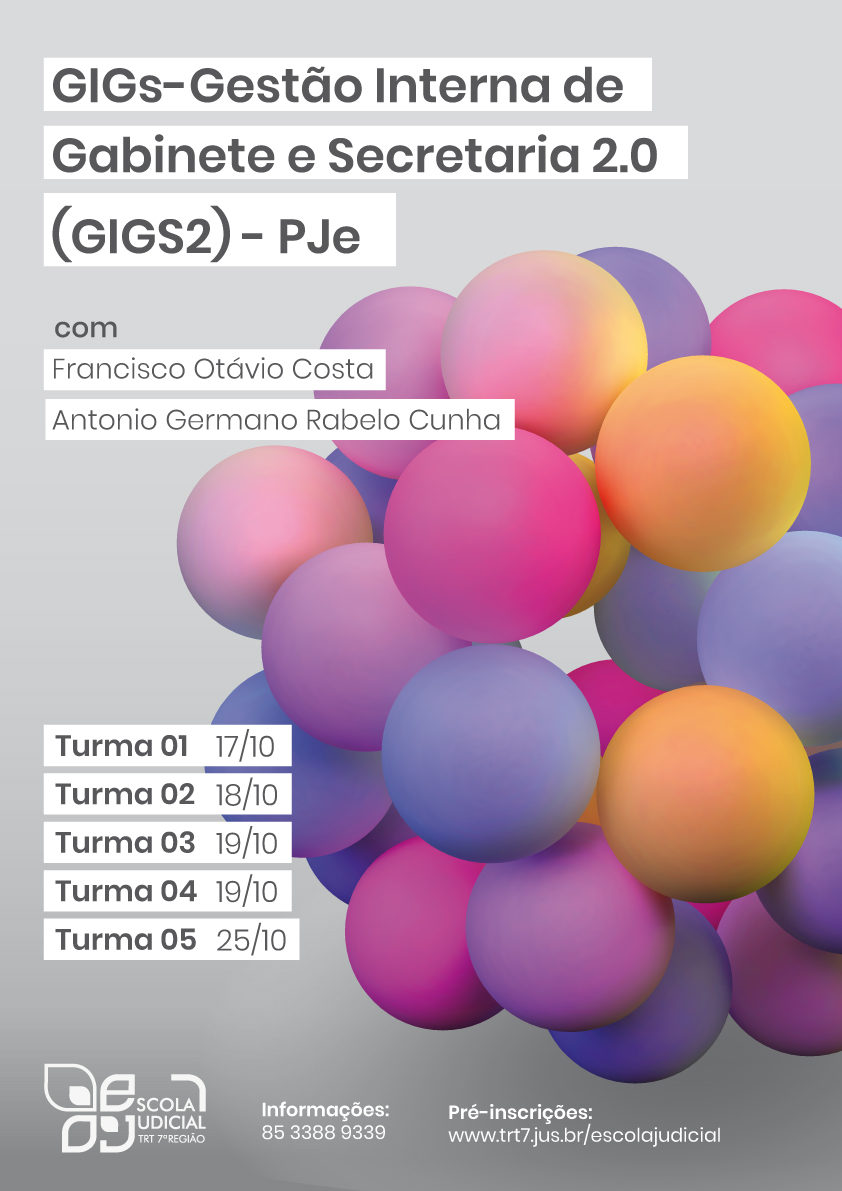 Com o propósito de disseminar e renovar nova metodologia e práticas no gerenciamento das informações processuais dentro das unidades judiciárias onde o servidor atua, a Escola Judicial abre inscrições para o curso “GIGs - Gestão Interna de Gabinete e Secretaria 2.0 (GIGS2) - PJe”, que será ministrado pelos servidores do TRT da 7ª Região Francisco Otávio Costa e Antonio Germano Rabelo Cunha, na Sala de Informática da Ejud7. Com carga horária de 04 horas/aula, o curso terá cinco turmas, distribuídas por local de lotação e será realizado nas datas, conforme abaixo especificado: