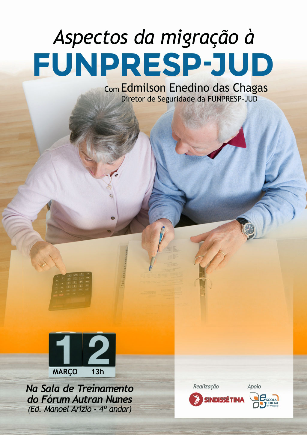 O Sindissétima com o apoio da Escola Judicial do TRT da 7ª Região, realizará a palestra "Aspectos da migração à FUNPRESP-JUD", com Edmilson Enedino das Chagas, Diretor de Seguridade da FUNPRESP-JUD, no próximo dia 12/03/2019, a partir das 13 horas, na Sala de Treinamento do Fórum Autran Nunes (Ed. Manoel Arízio - 4º andar).