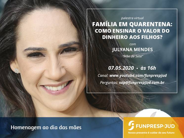 Em homenagem ao Dia das Mães, a Funpresp-Jud realizará uma live com Julyana Mendes, conhecida nas redes sociais como “Mãe de Sete”. O evento será no dia 7 de maio (quinta-feira), às 16 horas, pelo canal da Fundação no Youtube. O tema será: Família em Quarentena: como ensinar o valor do dinheiro aos filhos?
