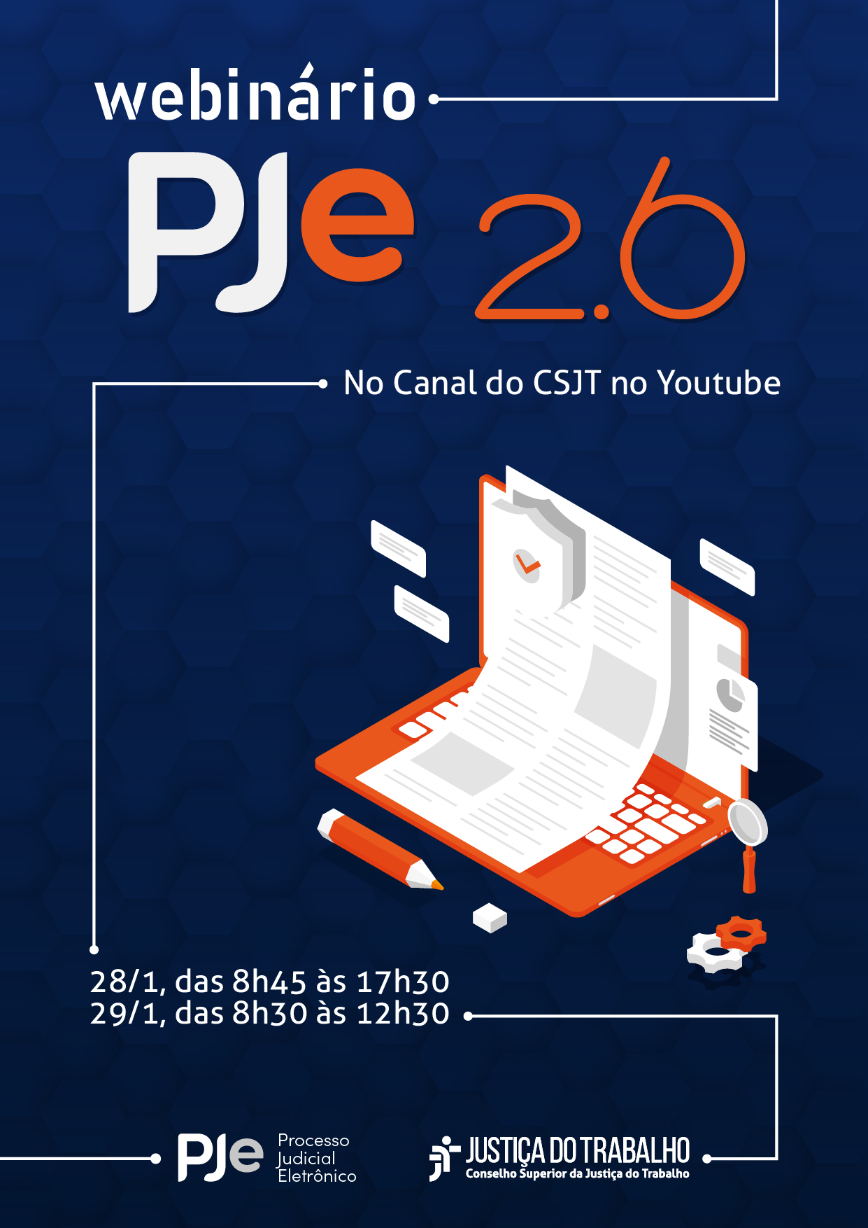 O Conselho Superior da Justiça do Trabalho (CSJT), por meio do Centro de Educação Corporativa da Justiça do Trabalho (Ceduc-JT), promoverá, nos dias 28 e 29 de janeiro, o “Webinário PJe 2.6”. O curso apresentará aos usuários internos (ministros, desembargadores, juízes e servidores da Justiça do Trabalho) as novidades da versão 2.6 do PJe. O evento será promovido à distância, por meio do canal oficial do CSJT no YouTube. Não é necessária inscrição prévia.