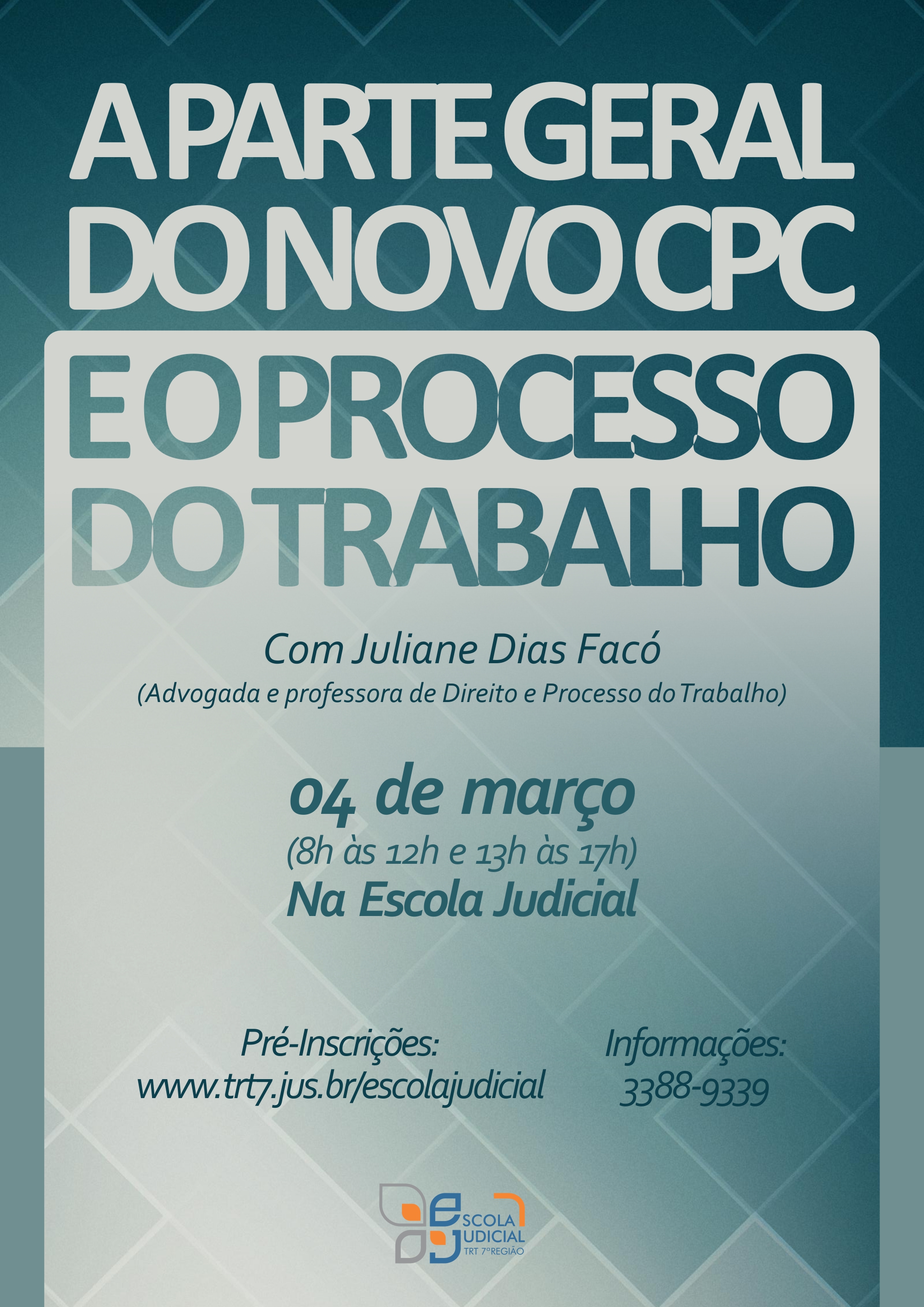 Inscrições abertas para magistrados e servidores interessados em participar do curso "A Parte Geral do Novo CPC e o Processo do Trabalho", que será realizado no dia 04 de março de 2016, das 8h às 12h e das 13h às 17h, no auditório da Escola Judicial (4º andar do anexo 2).